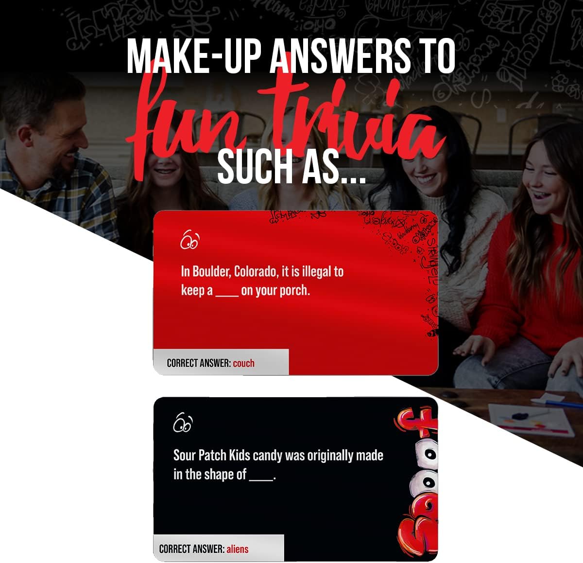 - Be Creative & Fool Your Friends: "Spoof" your friends by making up clever, fake answers to fun trivia such as "_______ is the national bird of Japan." "_______ is illegal to have on your porch in Arizona." Be careful with the correct answers!
